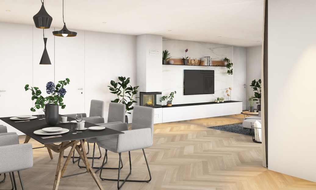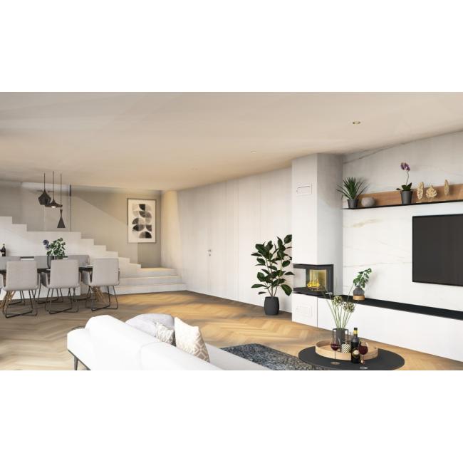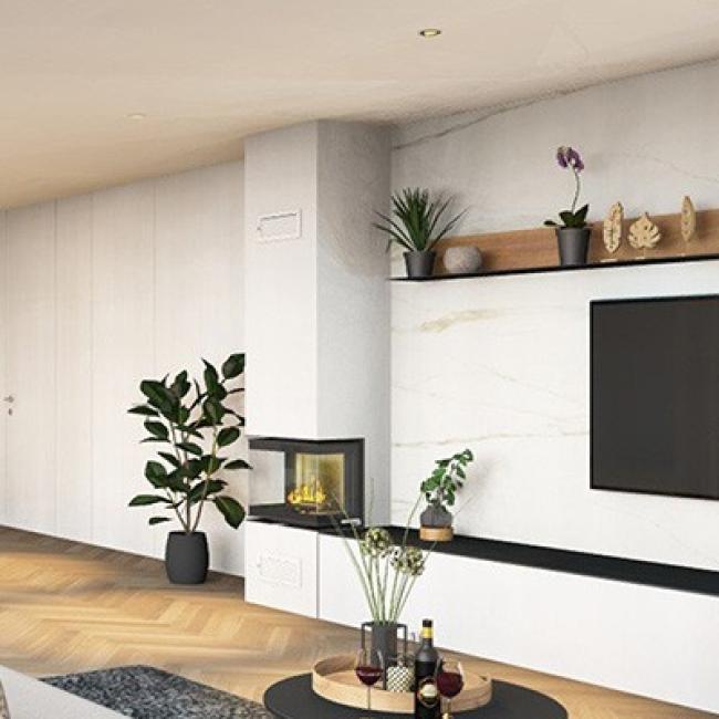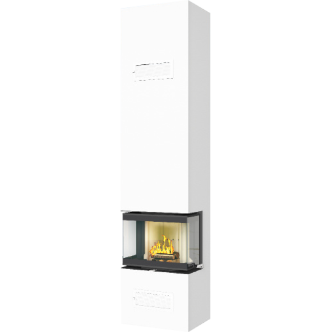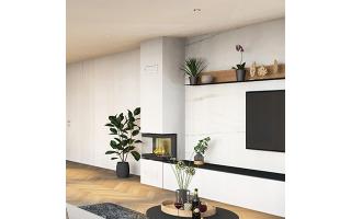Kamin IMAG LITE s kaminskim vložkom s tristransko zasteklitvijo v velikosti 55,8 x 43 x 29,8 cm in krilnim odpiranjem.