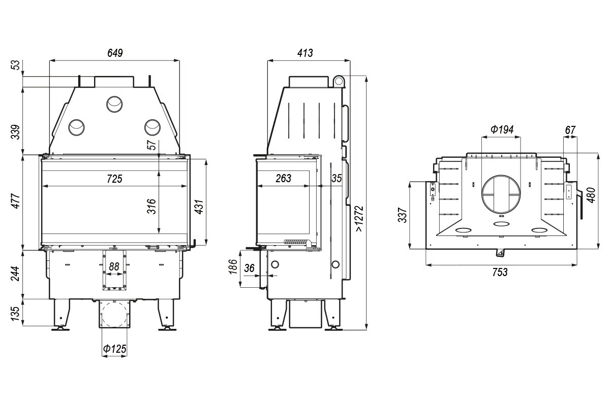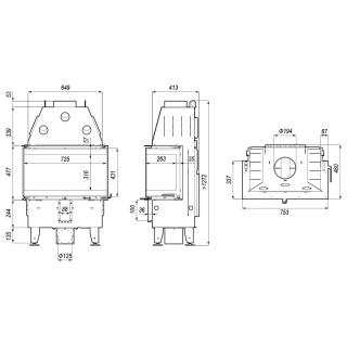 Kamin IMAG LITE s kaminskim vložkom s tristransko zasteklitvijo v velikosti 72,5 x 43 x 29,8 cm cm in krilnim odpiranjem