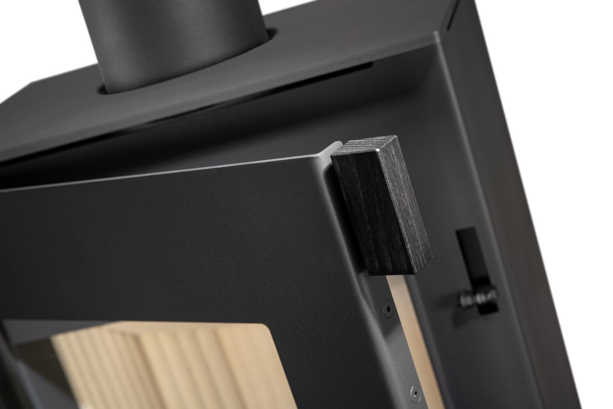 Peč je opremljena s samozaklepnim mehanizmom odprtih vrat, kar omogoča enostavno upravljanje in polnjenje. Lahko se zanesete na dvotočkovni zapiralni mehanizem s fiksno fiksacijo. Kljuka za vrata iz masivnega lesa odlično dopolnjuje celoten dizajn peči.