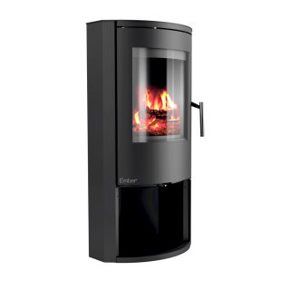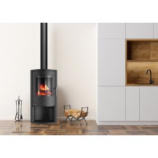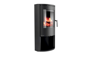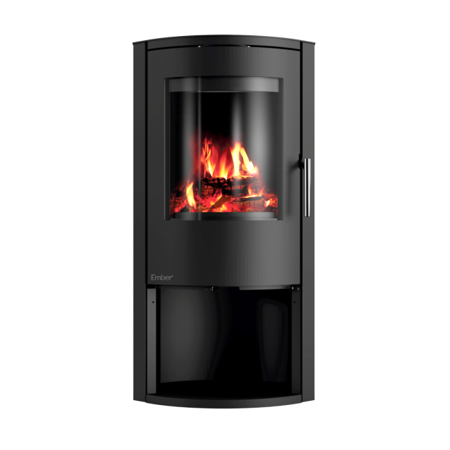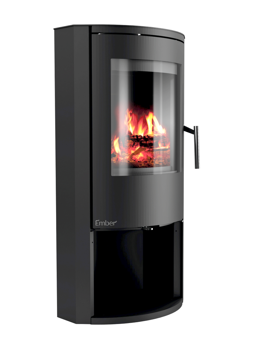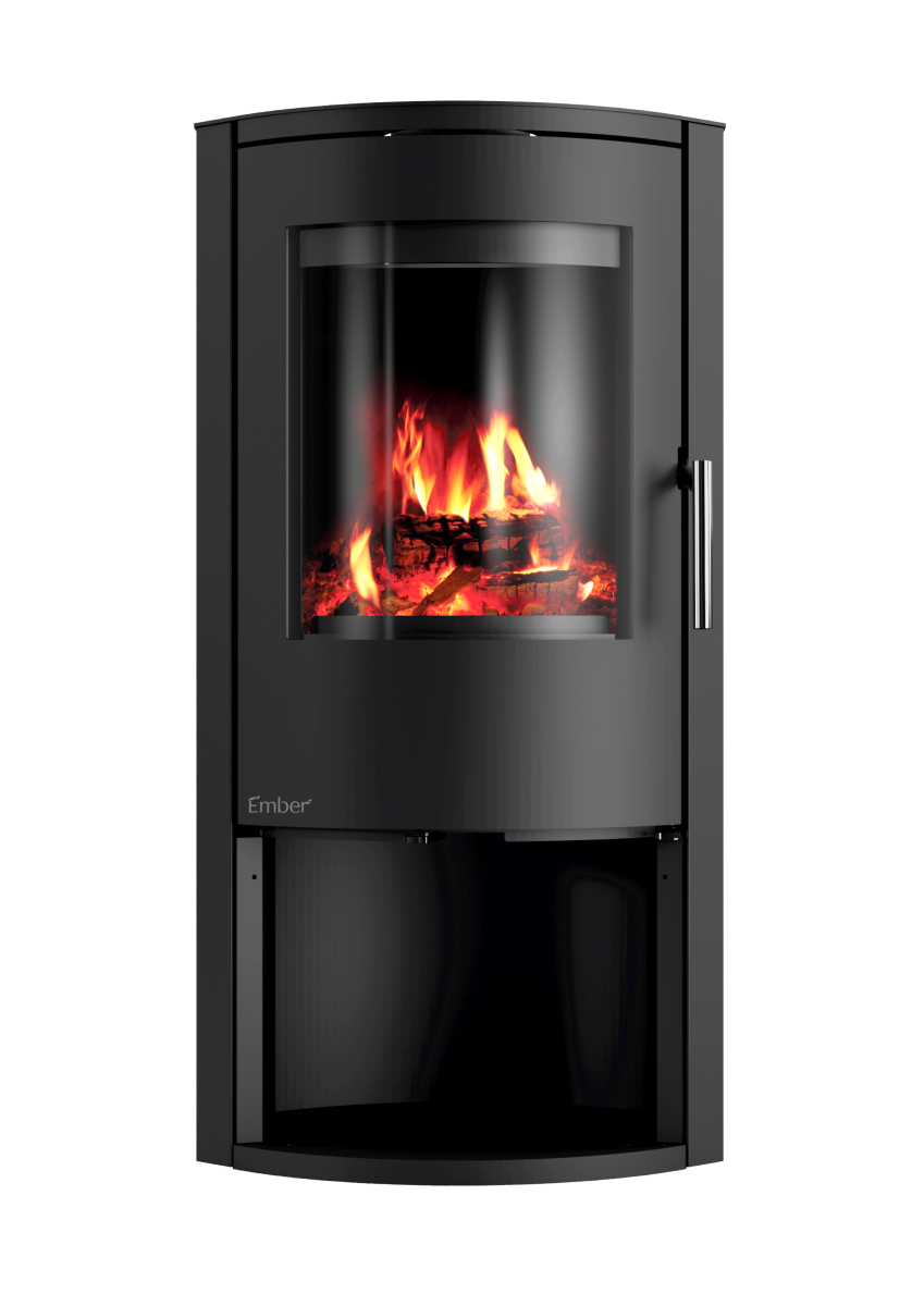 E-basic je samostoječa kaminska peč zanimive ovalne oblike s prostorom za drva pod kuriščem.